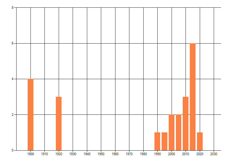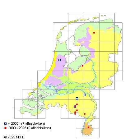 Het aantal atlasblokken (5x5 km) waarin de soort is gemeld binnen een periode van vijf jaar (vanaf 1980) of twintig jaar. Niet gecorrigeerd voor waarnemersinspanning en het aantal doorgegeven waarnemingen kan sterk variëren per periode, dus een trend in verspreiding kan hier niet direct uit worden afgelezen. Het opgegeven jaartal is het eerste jaar van de periode. Bron: gevalideerde waarnemingen uit de NDFF.