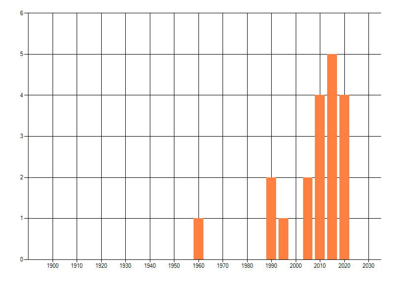 Het aantal atlasblokken (5x5 km) waarin de soort is gemeld binnen een periode van vijf jaar (vanaf 1980) of twintig jaar. Niet gecorrigeerd voor waarnemersinspanning en het aantal doorgegeven waarnemingen kan sterk variëren per periode, dus een trend in verspreiding kan hier niet direct uit worden afgelezen. Het opgegeven jaartal is het eerste jaar van de periode. Bron: gevalideerde waarnemingen uit de NDFF.