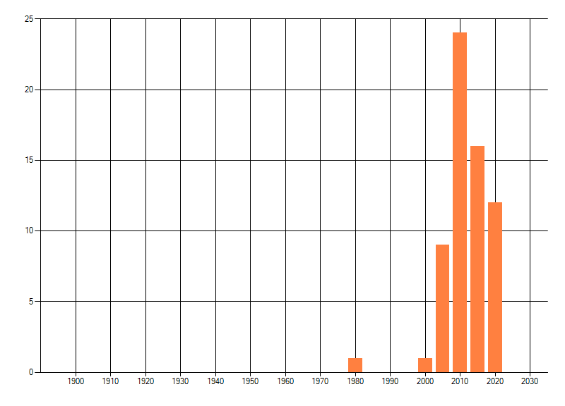 Het aantal atlasblokken (5x5 km) waarin de soort is gemeld binnen een periode van vijf jaar (vanaf 1980) of twintig jaar. Niet gecorrigeerd voor waarnemersinspanning en het aantal doorgegeven waarnemingen kan sterk variëren per periode, dus een trend in verspreiding kan hier niet direct uit worden afgelezen. Het opgegeven jaartal is het eerste jaar van de periode. Bron: gevalideerde waarnemingen uit de NDFF.