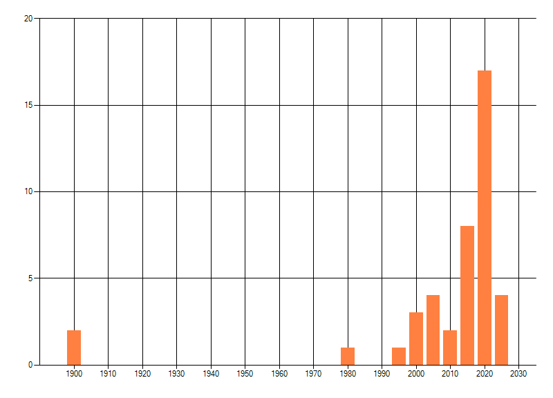 Het aantal atlasblokken (5x5 km) waarin de soort is gemeld binnen een periode van vijf jaar (vanaf 1980) of twintig jaar. Niet gecorrigeerd voor waarnemersinspanning en het aantal doorgegeven waarnemingen kan sterk variëren per periode, dus een trend in verspreiding kan hier niet direct uit worden afgelezen. Het opgegeven jaartal is het eerste jaar van de periode. Bron: gevalideerde waarnemingen uit de NDFF.