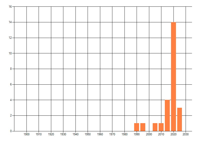 Het aantal atlasblokken (5x5 km) waarin de soort is gemeld binnen een periode van vijf jaar (vanaf 1980) of twintig jaar. Niet gecorrigeerd voor waarnemersinspanning en het aantal doorgegeven waarnemingen kan sterk variëren per periode, dus een trend in verspreiding kan hier niet direct uit worden afgelezen. Het opgegeven jaartal is het eerste jaar van de periode. Bron: gevalideerde waarnemingen uit de NDFF.