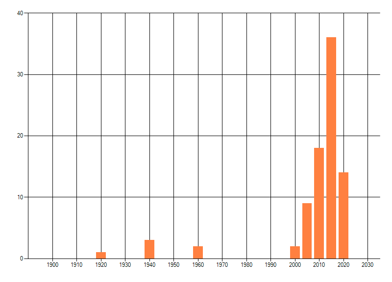 Het aantal atlasblokken (5x5 km) waarin de soort is gemeld binnen een periode van vijf jaar (vanaf 1980) of twintig jaar. Niet gecorrigeerd voor waarnemersinspanning en het aantal doorgegeven waarnemingen kan sterk variëren per periode, dus een trend in verspreiding kan hier niet direct uit worden afgelezen. Het opgegeven jaartal is het eerste jaar van de periode. Bron: gevalideerde waarnemingen uit de NDFF.
