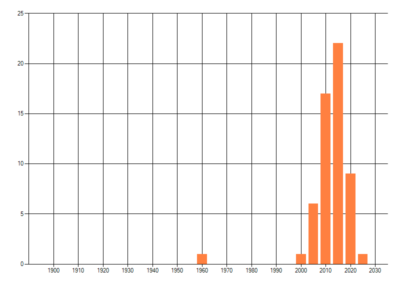 Het aantal atlasblokken (5x5 km) waarin de soort is gemeld binnen een periode van vijf jaar (vanaf 1980) of twintig jaar. Niet gecorrigeerd voor waarnemersinspanning en het aantal doorgegeven waarnemingen kan sterk variëren per periode, dus een trend in verspreiding kan hier niet direct uit worden afgelezen. Het opgegeven jaartal is het eerste jaar van de periode. Bron: gevalideerde waarnemingen uit de NDFF.