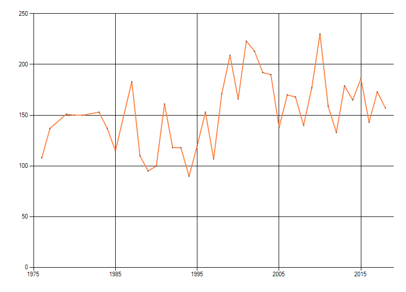 In de grafiek correspondeert ieder punt met het laatste jaar van zo'n periode.