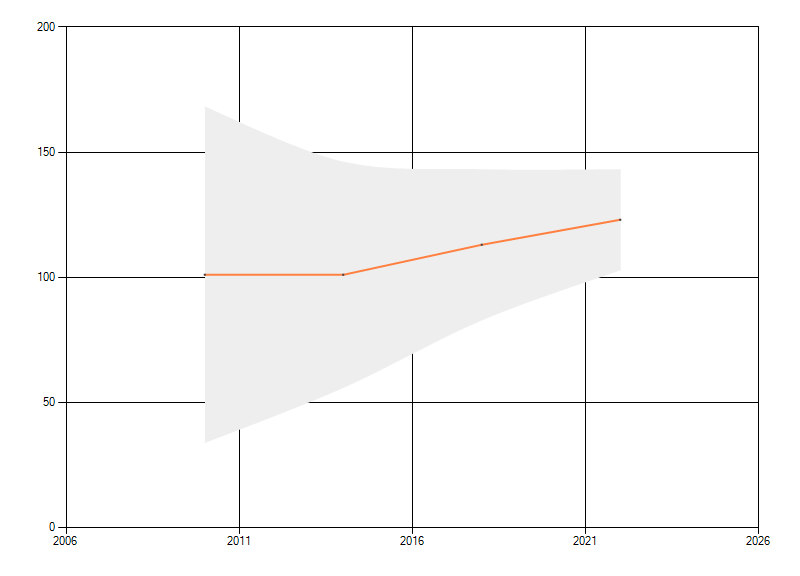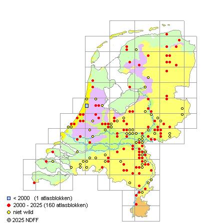 Gemiddelde trend van het aantal kilometerhokken waarin de soort voorkomt, weergegeven als indexcijfer (1975-1978 = 100). De trend is gecorrigeerd voor waarnemersinspanning en geeft de relatieve verandering in het aantal bezette kilometerhokken weer. Voor de berekening worden de data per periode van vier jaar samengenomen. In de grafiek correspondeert ieder punt met het laatste jaar van zo'n periode.