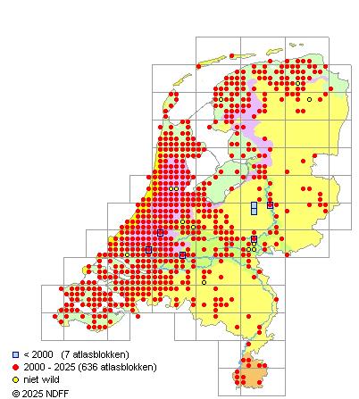 Het aantal atlasblokken (5x5 km) waarin de soort is gemeld binnen een periode van vijf jaar (vanaf 1980) of twintig jaar. Niet gecorrigeerd voor waarnemersinspanning en het aantal doorgegeven waarnemingen kan sterk variëren per periode, dus een trend in verspreiding kan hier niet direct uit worden afgelezen. Het opgegeven jaartal is het eerste jaar van de periode. Bron: gevalideerde waarnemingen uit de NDFF.