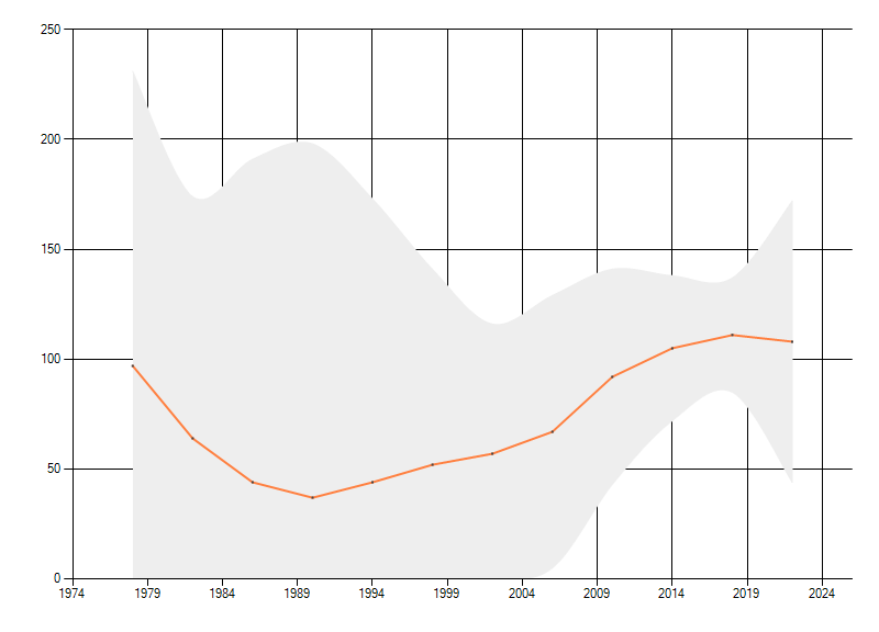 Gemiddelde trend van het aantal kilometerhokken waarin de soort voorkomt, weergegeven als indexcijfer (1975-1978 = 100). De trend is gecorrigeerd voor waarnemersinspanning en geeft de relatieve verandering in het aantal bezette kilometerhokken weer. Voor de berekening worden de data per periode van vier jaar samengenomen. In de grafiek correspondeert ieder punt met het laatste jaar van zo'n periode.
