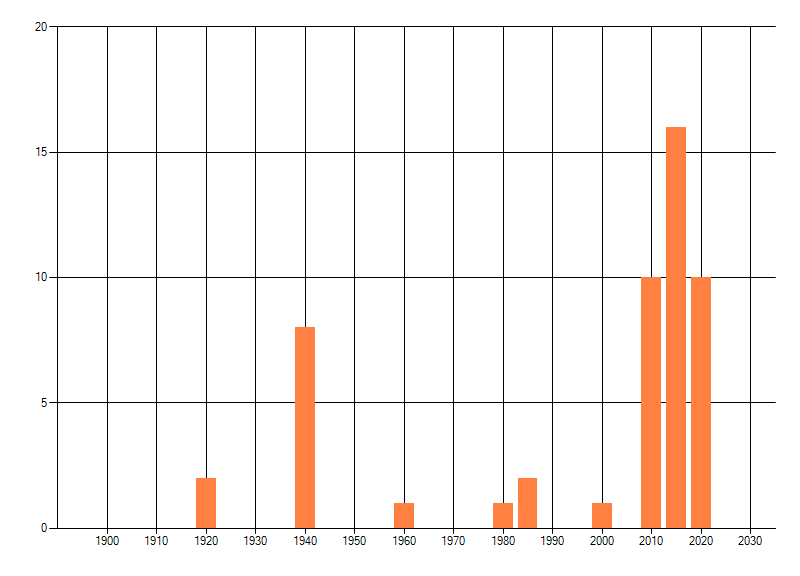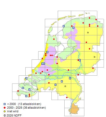 Het aantal atlasblokken (5x5 km) waarin de soort is gemeld binnen een periode van vijf jaar (vanaf 1980) of twintig jaar. Niet gecorrigeerd voor waarnemersinspanning en het aantal doorgegeven waarnemingen kan sterk variëren per periode, dus een trend in verspreiding kan hier niet direct uit worden afgelezen. Het opgegeven jaartal is het eerste jaar van de periode. Bron: gevalideerde waarnemingen uit de NDFF.