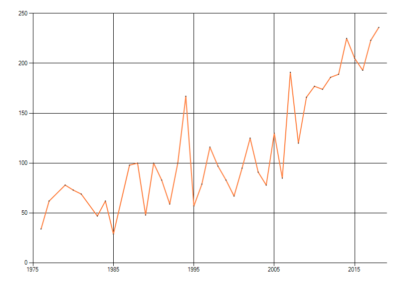 Gemiddelde trend van het aantal kilometerhokken waarin de soort voorkomt, weergegeven als indexcijfer (1975-1978 = 100). De trend is gecorrigeerd voor waarnemersinspanning en geeft de relatieve verandering in het aantal bezette kilometerhokken weer. Voor de berekening worden de data per periode van vier jaar samengenomen. In de grafiek correspondeert ieder punt met het laatste jaar van zo'n periode.