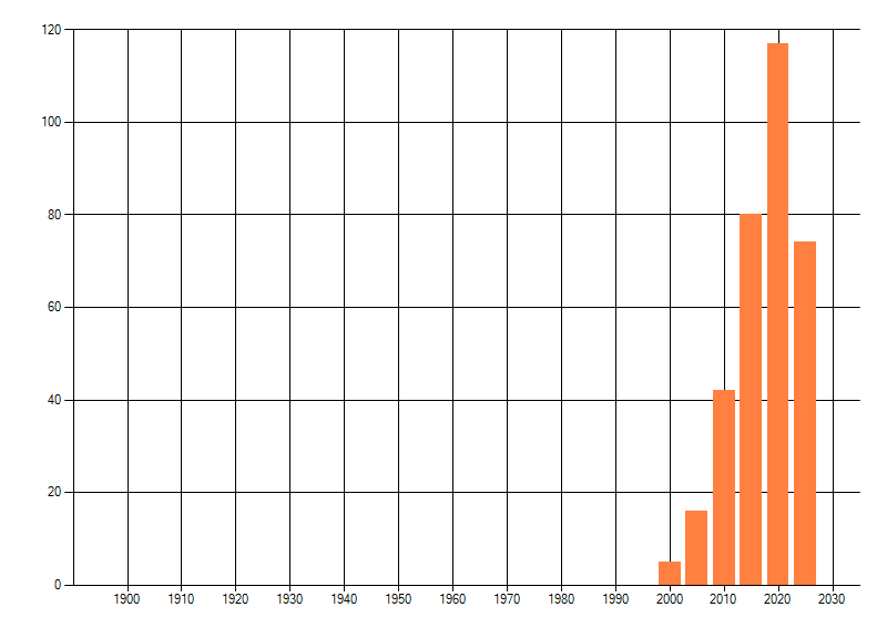 Het aantal atlasblokken (5x5 km) waarin de soort is gemeld binnen een periode van vijf jaar (vanaf 1980) of twintig jaar. Niet gecorrigeerd voor waarnemersinspanning en het aantal doorgegeven waarnemingen kan sterk variëren per periode, dus een trend in verspreiding kan hier niet direct uit worden afgelezen. Het opgegeven jaartal is het eerste jaar van de periode. Bron: gevalideerde waarnemingen uit de NDFF.