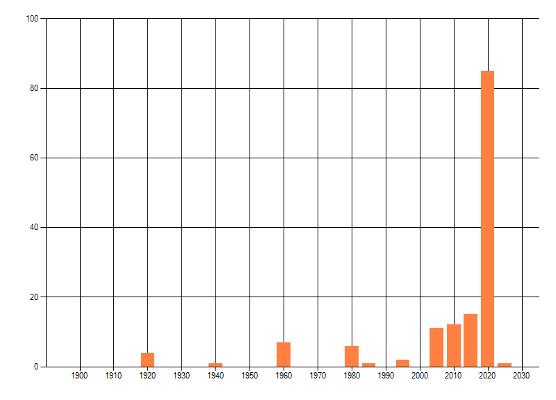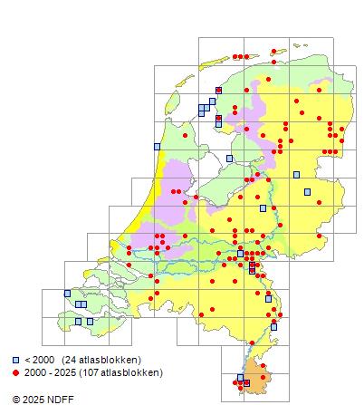 Het aantal atlasblokken (5x5 km) waarin de soort is gemeld binnen een periode van vijf jaar (vanaf 1980) of twintig jaar. Niet gecorrigeerd voor waarnemersinspanning en het aantal doorgegeven waarnemingen kan sterk variëren per periode, dus een trend in verspreiding kan hier niet direct uit worden afgelezen. Het opgegeven jaartal is het eerste jaar van de periode. Bron: gevalideerde waarnemingen uit de NDFF.
