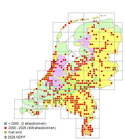 Het aantal atlasblokken (5x5 km) waarin de soort is gemeld binnen een periode van vijf jaar (vanaf 1980) of twintig jaar. Niet gecorrigeerd voor waarnemersinspanning en het aantal doorgegeven waarnemingen kan sterk variëren per periode, dus een trend in verspreiding kan hier niet direct uit worden afgelezen. Het opgegeven jaartal is het eerste jaar van de periode. Bron: gevalideerde waarnemingen uit de NDFF.
