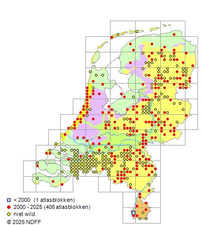Het aantal atlasblokken (5x5 km) waarin de soort is gemeld binnen een periode van vijf jaar (vanaf 1980) of twintig jaar. Niet gecorrigeerd voor waarnemersinspanning en het aantal doorgegeven waarnemingen kan sterk variëren per periode, dus een trend in verspreiding kan hier niet direct uit worden afgelezen. Het opgegeven jaartal is het eerste jaar van de periode. Bron: gevalideerde waarnemingen uit de NDFF.