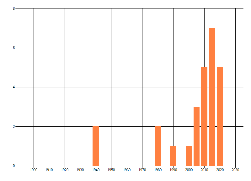 Het aantal atlasblokken (5x5 km) waarin de soort is gemeld binnen een periode van vijf jaar (vanaf 1980) of twintig jaar. Niet gecorrigeerd voor waarnemersinspanning en het aantal doorgegeven waarnemingen kan sterk variëren per periode, dus een trend in verspreiding kan hier niet direct uit worden afgelezen. Het opgegeven jaartal is het eerste jaar van de periode. Bron: gevalideerde waarnemingen uit de NDFF.
