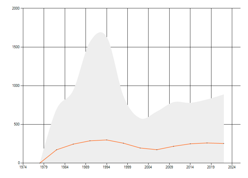 Gemiddelde trend van het aantal kilometerhokken waarin de soort voorkomt, weergegeven als indexcijfer (1975-1978 = 100). De trend is gecorrigeerd voor waarnemersinspanning en geeft de relatieve verandering in het aantal bezette kilometerhokken weer. Voor de berekening worden de data per periode van vier jaar samengenomen. In de grafiek correspondeert ieder punt met het laatste jaar van zo'n periode.