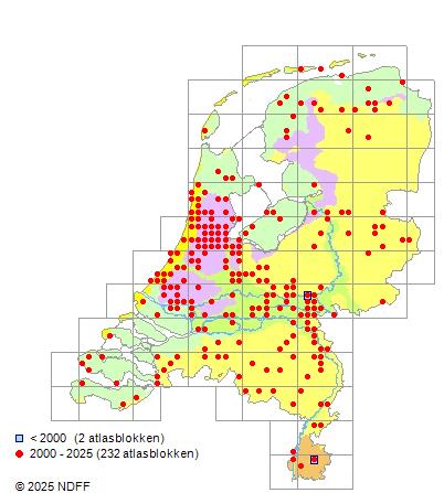 Het aantal atlasblokken (5x5 km) waarin de soort is gemeld binnen een periode van vijf jaar (vanaf 1980) of twintig jaar. Niet gecorrigeerd voor waarnemersinspanning en het aantal doorgegeven waarnemingen kan sterk variëren per periode, dus een trend in verspreiding kan hier niet direct uit worden afgelezen. Het opgegeven jaartal is het eerste jaar van de periode. Bron: gevalideerde waarnemingen uit de NDFF.