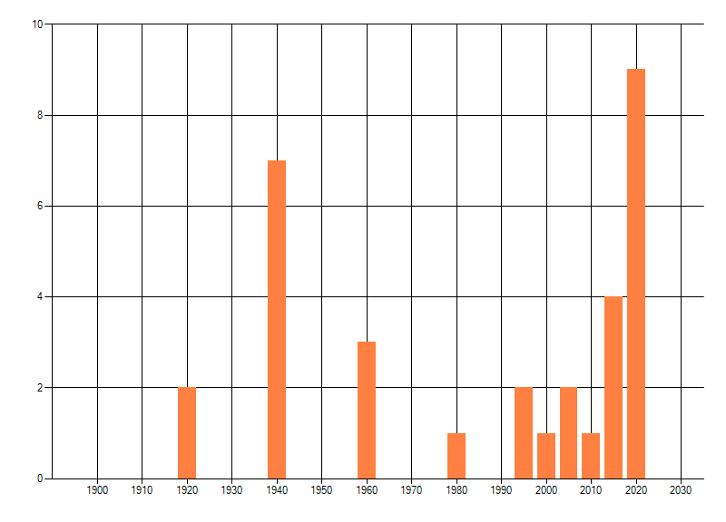 Het aantal atlasblokken (5x5 km) waarin de soort is gemeld binnen een periode van vijf jaar (vanaf 1980) of twintig jaar. Niet gecorrigeerd voor waarnemersinspanning en het aantal doorgegeven waarnemingen kan sterk variëren per periode, dus een trend in verspreiding kan hier niet direct uit worden afgelezen. Het opgegeven jaartal is het eerste jaar van de periode. Bron: gevalideerde waarnemingen uit de NDFF.