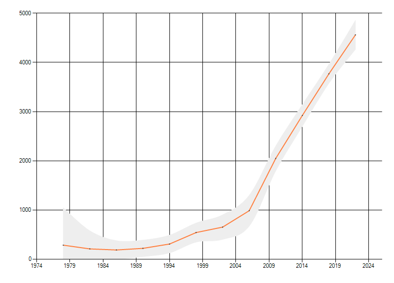 Gemiddelde trend van het aantal kilometerhokken waarin de soort voorkomt, weergegeven als indexcijfer (1975-1978 = 100). De trend is gecorrigeerd voor waarnemersinspanning en geeft de relatieve verandering in het aantal bezette kilometerhokken weer. Voor de berekening worden de data per periode van vier jaar samengenomen. In de grafiek correspondeert ieder punt met het laatste jaar van zo'n periode.