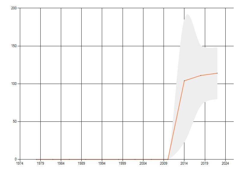 Gemiddelde trend van het aantal kilometerhokken waarin de soort voorkomt, weergegeven als indexcijfer (1975-1978 = 100). De trend is gecorrigeerd voor waarnemersinspanning en geeft de relatieve verandering in het aantal bezette kilometerhokken weer. Voor de berekening worden de data per periode van vier jaar samengenomen. In de grafiek correspondeert ieder punt met het laatste jaar van zo'n periode.