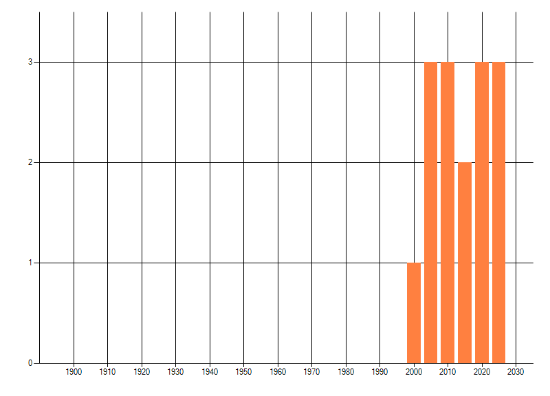 Het aantal atlasblokken (5x5 km) waarin de soort is gemeld binnen een periode van vijf jaar (vanaf 1980) of twintig jaar. Niet gecorrigeerd voor waarnemersinspanning en het aantal doorgegeven waarnemingen kan sterk variëren per periode, dus een trend in verspreiding kan hier niet direct uit worden afgelezen. Het opgegeven jaartal is het eerste jaar van de periode. Bron: gevalideerde waarnemingen uit de NDFF.