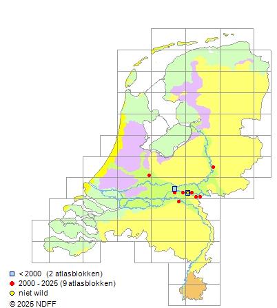 Het aantal atlasblokken (5x5 km) waarin de soort is gemeld binnen een periode van vijf jaar (vanaf 1980) of twintig jaar. Niet gecorrigeerd voor waarnemersinspanning en het aantal doorgegeven waarnemingen kan sterk variëren per periode, dus een trend in verspreiding kan hier niet direct uit worden afgelezen. Het opgegeven jaartal is het eerste jaar van de periode. Bron: gevalideerde waarnemingen uit de NDFF.