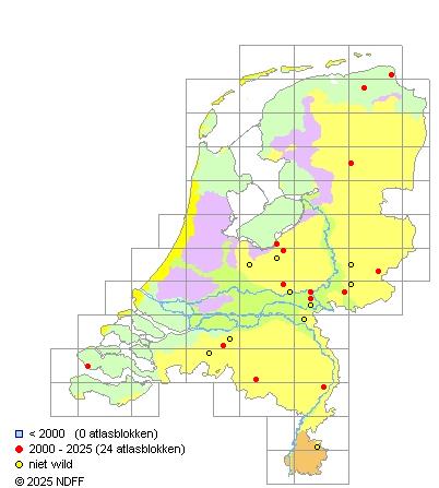 Het aantal atlasblokken (5x5 km) waarin de soort is gemeld binnen een periode van vijf jaar (vanaf 1980) of twintig jaar.