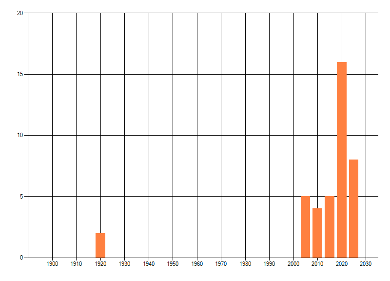 Het aantal atlasblokken (5x5 km) waarin de soort is gemeld binnen een periode van vijf jaar (vanaf 1980) of twintig jaar. Niet gecorrigeerd voor waarnemersinspanning en het aantal doorgegeven waarnemingen kan sterk variëren per periode, dus een trend in verspreiding kan hier niet direct uit worden afgelezen. Het opgegeven jaartal is het eerste jaar van de periode. Bron: gevalideerde waarnemingen uit de NDFF.