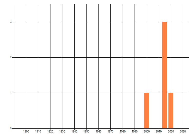 Het aantal atlasblokken (5x5 km) waarin de soort is gemeld binnen een periode van vijf jaar (vanaf 1980) of twintig jaar. Niet gecorrigeerd voor waarnemersinspanning en het aantal doorgegeven waarnemingen kan sterk variëren per periode, dus een trend in verspreiding kan hier niet direct uit worden afgelezen. Het opgegeven jaartal is het eerste jaar van de periode. Bron: gevalideerde waarnemingen uit de NDFF.