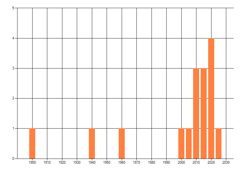 Het aantal atlasblokken (5x5 km) waarin de soort is gemeld binnen een periode van vijf jaar (vanaf 1980) of twintig jaar. Niet gecorrigeerd voor waarnemersinspanning en het aantal doorgegeven waarnemingen kan sterk variëren per periode, dus een trend in verspreiding kan hier niet direct uit worden afgelezen. Het opgegeven jaartal is het eerste jaar van de periode. Bron: gevalideerde waarnemingen uit de NDFF.