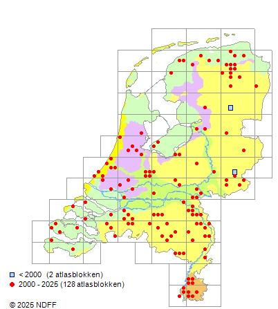 Het aantal atlasblokken (5x5 km) waarin de soort is gemeld binnen een periode van vijf jaar (vanaf 1980) of twintig jaar. Niet gecorrigeerd voor waarnemersinspanning en het aantal doorgegeven waarnemingen kan sterk variëren per periode, dus een trend in verspreiding kan hier niet direct uit worden afgelezen. Het opgegeven jaartal is het eerste jaar van de periode. Bron: gevalideerde waarnemingen uit de NDFF.
