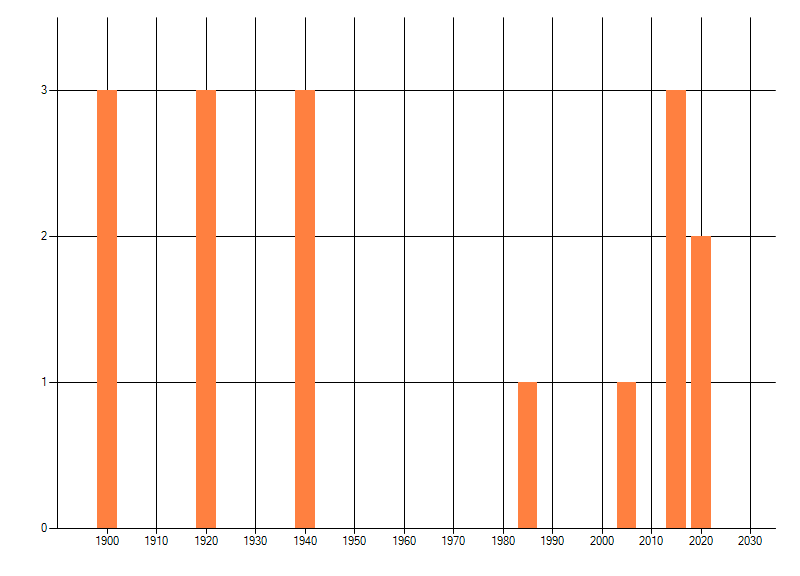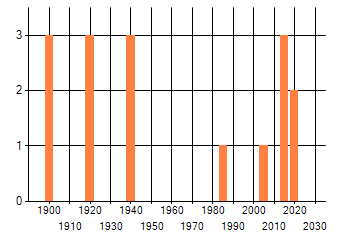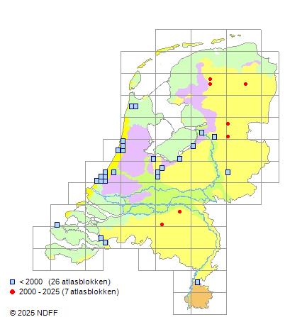 Het aantal atlasblokken (5x5 km) waarin de soort is gemeld binnen een periode van vijf jaar (vanaf 1980) of twintig jaar. Niet gecorrigeerd voor waarnemersinspanning en het aantal doorgegeven waarnemingen kan sterk variëren per periode, dus een trend in verspreiding kan hier niet direct uit worden afgelezen. Het opgegeven jaartal is het eerste jaar van de periode. Bron: gevalideerde waarnemingen uit de NDFF.