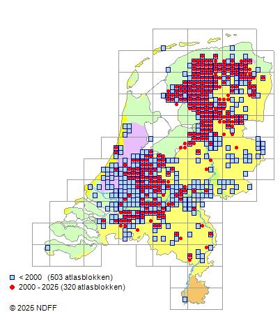 Het aantal atlasblokken (5x5 km) waarin de soort is gemeld binnen een periode van vijf jaar (vanaf 1980) of twintig jaar. Niet gecorrigeerd voor waarnemersinspanning en het aantal doorgegeven waarnemingen kan sterk variëren per periode, dus een trend in verspreiding kan hier niet direct uit worden afgelezen. Het opgegeven jaartal is het eerste jaar van de periode. Bron: gevalideerde waarnemingen uit de NDFF.