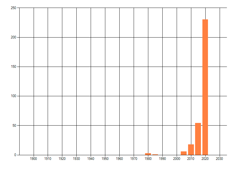 Het aantal atlasblokken (5x5 km) waarin de soort is gemeld binnen een periode van vijf jaar (vanaf 1980) of twintig jaar. Niet gecorrigeerd voor waarnemersinspanning en het aantal doorgegeven waarnemingen kan sterk variëren per periode, dus een trend in verspreiding kan hier niet direct uit worden afgelezen. Het opgegeven jaartal is het eerste jaar van de periode. Bron: gevalideerde waarnemingen uit de NDFF.
