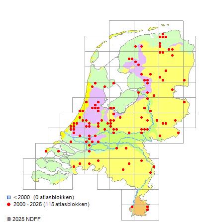 Het aantal atlasblokken (5x5 km) waarin de soort is gemeld binnen een periode van vijf jaar (vanaf 1980) of twintig jaar. Niet gecorrigeerd voor waarnemersinspanning en het aantal doorgegeven waarnemingen kan sterk variëren per periode, dus een trend in verspreiding kan hier niet direct uit worden afgelezen. Het opgegeven jaartal is het eerste jaar van de periode. Bron: gevalideerde waarnemingen uit de NDFF.