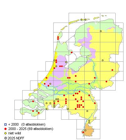 Het aantal atlasblokken (5x5 km) waarin de soort is gemeld binnen een periode van vijf jaar (vanaf 1980) of twintig jaar. Niet gecorrigeerd voor waarnemersinspanning en het aantal doorgegeven waarnemingen kan sterk variëren per periode, dus een trend in verspreiding kan hier niet direct uit worden afgelezen. Het opgegeven jaartal is het eerste jaar van de periode. Bron: gevalideerde waarnemingen uit de NDFF.