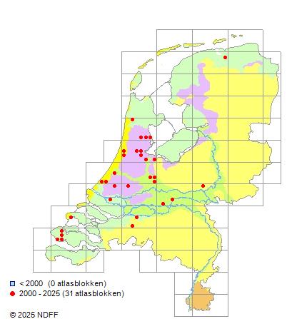 Het aantal atlasblokken (5x5 km) waarin de soort is gemeld binnen een periode van vijf jaar (vanaf 1980) of twintig jaar. Niet gecorrigeerd voor waarnemersinspanning en het aantal doorgegeven waarnemingen kan sterk variëren per periode, dus een trend in verspreiding kan hier niet direct uit worden afgelezen. Het opgegeven jaartal is het eerste jaar van de periode. Bron: gevalideerde waarnemingen uit de NDFF.