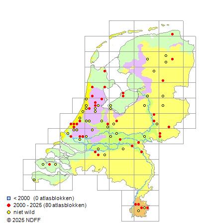 Het aantal atlasblokken (5x5 km) waarin de soort is gemeld binnen een periode van vijf jaar (vanaf 1980) of twintig jaar. Niet gecorrigeerd voor waarnemersinspanning en het aantal doorgegeven waarnemingen kan sterk variëren per periode, dus een trend in verspreiding kan hier niet direct uit worden afgelezen. Het opgegeven jaartal is het eerste jaar van de periode. Bron: gevalideerde waarnemingen uit de NDFF.