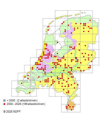 Het aantal atlasblokken (5x5 km) waarin de soort is gemeld binnen een periode van vijf jaar (vanaf 1980) of twintig jaar. Niet gecorrigeerd voor waarnemersinspanning en het aantal doorgegeven waarnemingen kan sterk variëren per periode, dus een trend in verspreiding kan hier niet direct uit worden afgelezen. Het opgegeven jaartal is het eerste jaar van de periode. Bron: gevalideerde waarnemingen uit de NDFF.