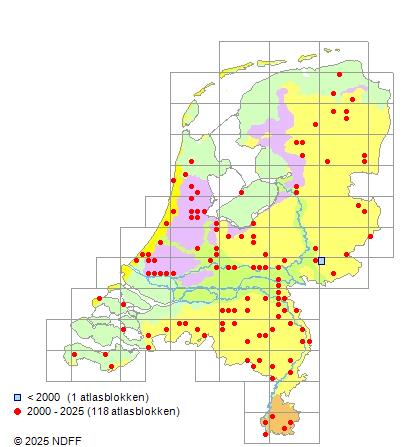 Het aantal atlasblokken (5x5 km) waarin de soort is gemeld binnen een periode van vijf jaar (vanaf 1980) of twintig jaar. Niet gecorrigeerd voor waarnemersinspanning en het aantal doorgegeven waarnemingen kan sterk variëren per periode, dus een trend in verspreiding kan hier niet direct uit worden afgelezen. Het opgegeven jaartal is het eerste jaar van de periode. Bron: gevalideerde waarnemingen uit de NDFF.
