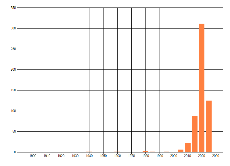 Het aantal atlasblokken (5x5 km) waarin de soort is gemeld binnen een periode van vijf jaar (vanaf 1980) of twintig jaar. Niet gecorrigeerd voor waarnemersinspanning en het aantal doorgegeven waarnemingen kan sterk variëren per periode, dus een trend in verspreiding kan hier niet direct uit worden afgelezen. Het opgegeven jaartal is het eerste jaar van de periode. Bron: gevalideerde waarnemingen uit de NDFF.