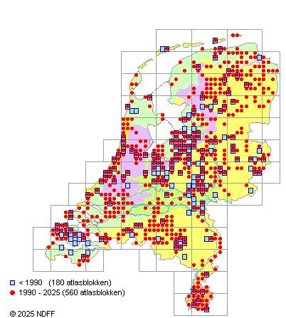 Het aantal atlasblokken (5x5 km) waarin de soort is gemeld binnen een periode van vijf jaar (vanaf 1980) of twintig jaar. Niet gecorrigeerd voor waarnemersinspanning en het aantal doorgegeven waarnemingen kan sterk variëren per periode, dus een trend in verspreiding kan hier niet direct uit worden afgelezen. Het opgegeven jaartal is het eerste jaar van de periode. Bron: gevalideerde waarnemingen uit de NDFF.