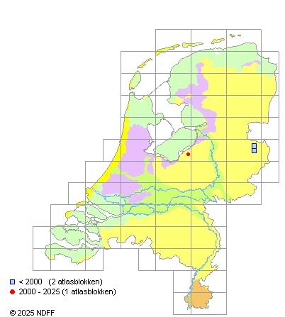 Het aantal atlasblokken (5x5 km) waarin de soort is gemeld binnen een periode van vijf jaar (vanaf 1980) of twintig jaar. Niet gecorrigeerd voor waarnemersinspanning en het aantal doorgegeven waarnemingen kan sterk variëren per periode, dus een trend in verspreiding kan hier niet direct uit worden afgelezen. Het opgegeven jaartal is het eerste jaar van de periode. Bron: gevalideerde waarnemingen uit de NDFF.