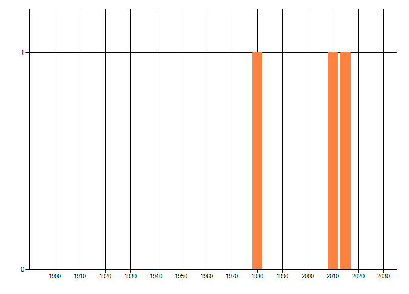 Het aantal atlasblokken (5x5 km) waarin de soort is gemeld binnen een periode van vijf jaar (vanaf 1980) of twintig jaar. Niet gecorrigeerd voor waarnemersinspanning en het aantal doorgegeven waarnemingen kan sterk variëren per periode, dus een trend in verspreiding kan hier niet direct uit worden afgelezen. Het opgegeven jaartal is het eerste jaar van de periode. Bron: gevalideerde waarnemingen uit de NDFF.