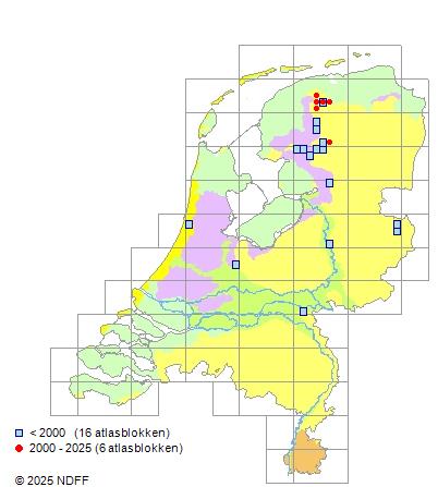 Het aantal atlasblokken (5x5 km) waarin de soort is gemeld binnen een periode van vijf jaar (vanaf 1980) of twintig jaar. Niet gecorrigeerd voor waarnemersinspanning en het aantal doorgegeven waarnemingen kan sterk variëren per periode, dus een trend in verspreiding kan hier niet direct uit worden afgelezen. Het opgegeven jaartal is het eerste jaar van de periode. Bron: gevalideerde waarnemingen uit de NDFF.