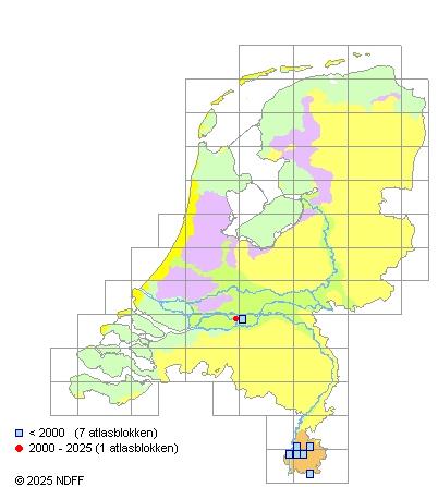 Het aantal atlasblokken (5x5 km) waarin de soort is gemeld binnen een periode van vijf jaar (vanaf 1980) of twintig jaar. Niet gecorrigeerd voor waarnemersinspanning en het aantal doorgegeven waarnemingen kan sterk variëren per periode, dus een trend in verspreiding kan hier niet direct uit worden afgelezen. Het opgegeven jaartal is het eerste jaar van de periode. Bron: gevalideerde waarnemingen uit de NDFF.