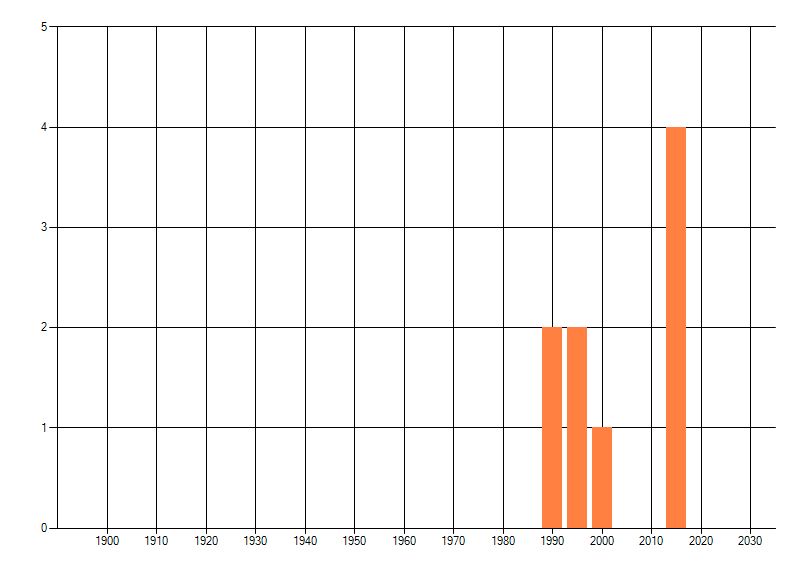 Het aantal atlasblokken (5x5 km) waarin de soort is gemeld binnen een periode van vijf jaar (vanaf 1980) of twintig jaar. Niet gecorrigeerd voor waarnemersinspanning en het aantal doorgegeven waarnemingen kan sterk variëren per periode, dus een trend in verspreiding kan hier niet direct uit worden afgelezen. Het opgegeven jaartal is het eerste jaar van de periode. Bron: gevalideerde waarnemingen uit de NDFF.
