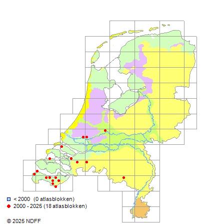 Het aantal atlasblokken (5x5 km) waarin de soort is gemeld binnen een periode van vijf jaar (vanaf 1980) of twintig jaar. Niet gecorrigeerd voor waarnemersinspanning en het aantal doorgegeven waarnemingen kan sterk variëren per periode, dus een trend in verspreiding kan hier niet direct uit worden afgelezen. Het opgegeven jaartal is het eerste jaar van de periode. Bron: gevalideerde waarnemingen uit de NDFF.