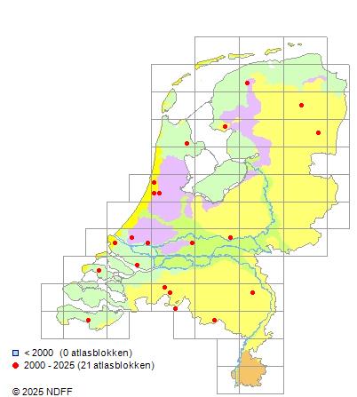 Het aantal atlasblokken (5x5 km) waarin de soort is gemeld binnen een periode van vijf jaar (vanaf 1980) of twintig jaar. Niet gecorrigeerd voor waarnemersinspanning en het aantal doorgegeven waarnemingen kan sterk variëren per periode, dus een trend in verspreiding kan hier niet direct uit worden afgelezen. Het opgegeven jaartal is het eerste jaar van de periode. Bron: gevalideerde waarnemingen uit de NDFF.