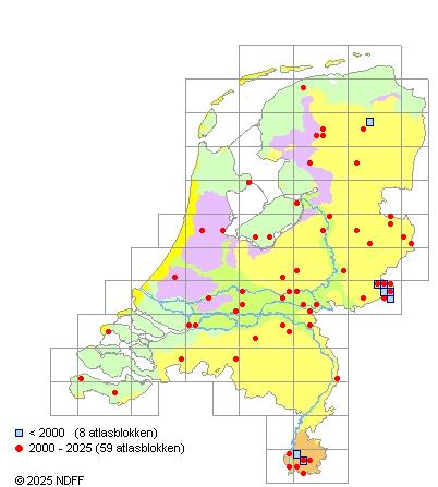 Het aantal atlasblokken (5x5 km) waarin de soort is gemeld binnen een periode van vijf jaar (vanaf 1980) of twintig jaar. Niet gecorrigeerd voor waarnemersinspanning en het aantal doorgegeven waarnemingen kan sterk variëren per periode, dus een trend in verspreiding kan hier niet direct uit worden afgelezen. Het opgegeven jaartal is het eerste jaar van de periode. Bron: gevalideerde waarnemingen uit de NDFF.