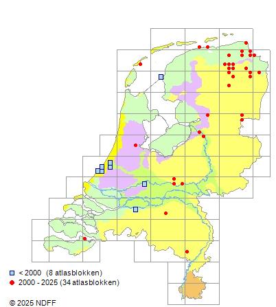 Het aantal atlasblokken (5x5 km) waarin de soort is gemeld binnen een periode van vijf jaar (vanaf 1980) of twintig jaar. Niet gecorrigeerd voor waarnemersinspanning en het aantal doorgegeven waarnemingen kan sterk variëren per periode, dus een trend in verspreiding kan hier niet direct uit worden afgelezen. Het opgegeven jaartal is het eerste jaar van de periode. Bron: gevalideerde waarnemingen uit de NDFF.